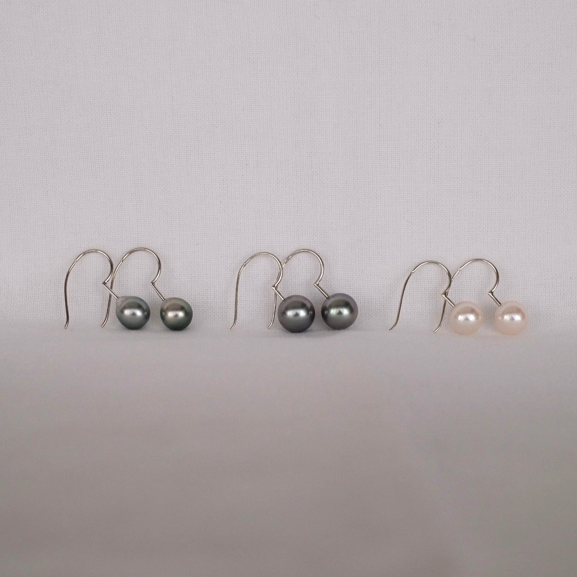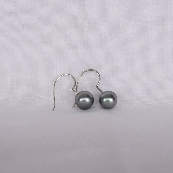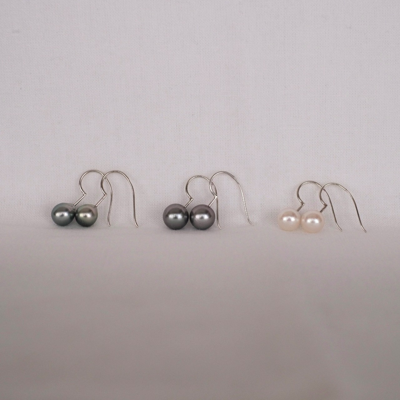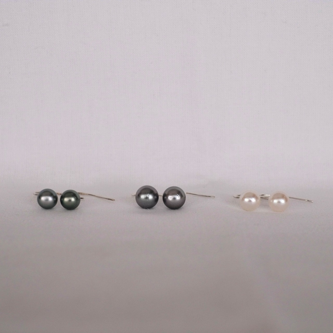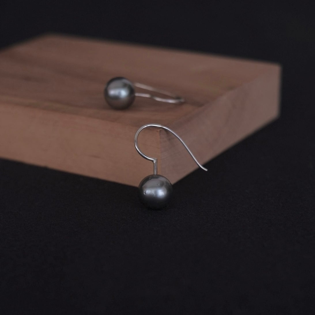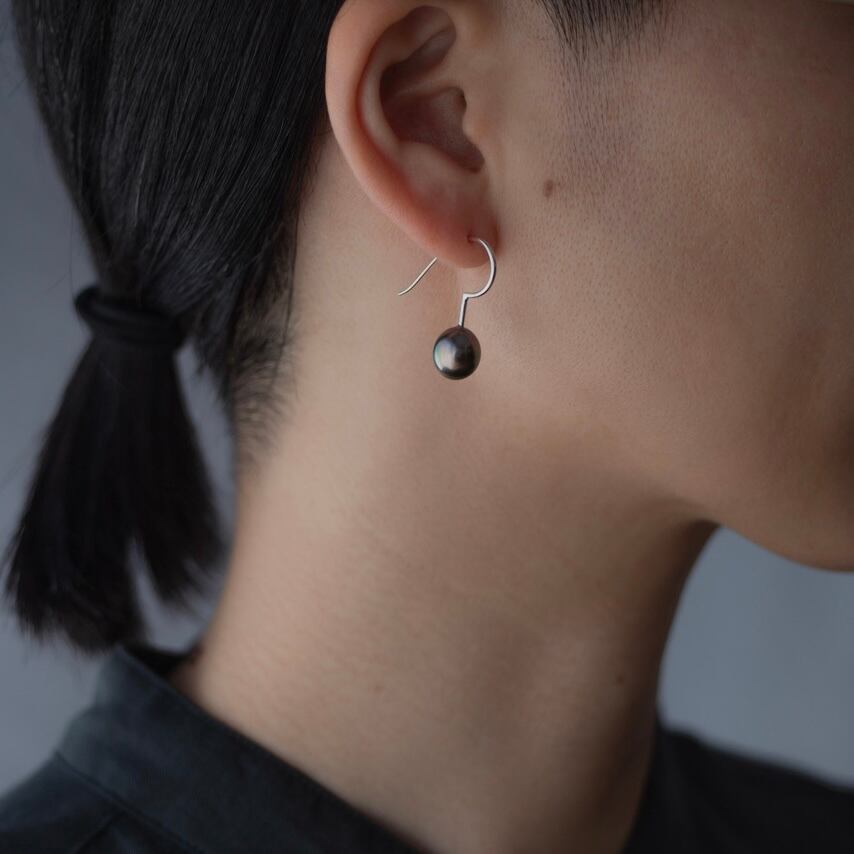 柔らかいグレーカラーで大粒の黒蝶真珠を選び取り仕立てました。美しく球に近い形に、ニュートラルグレーのようでいて淡く紫の干渉色が感じられます。