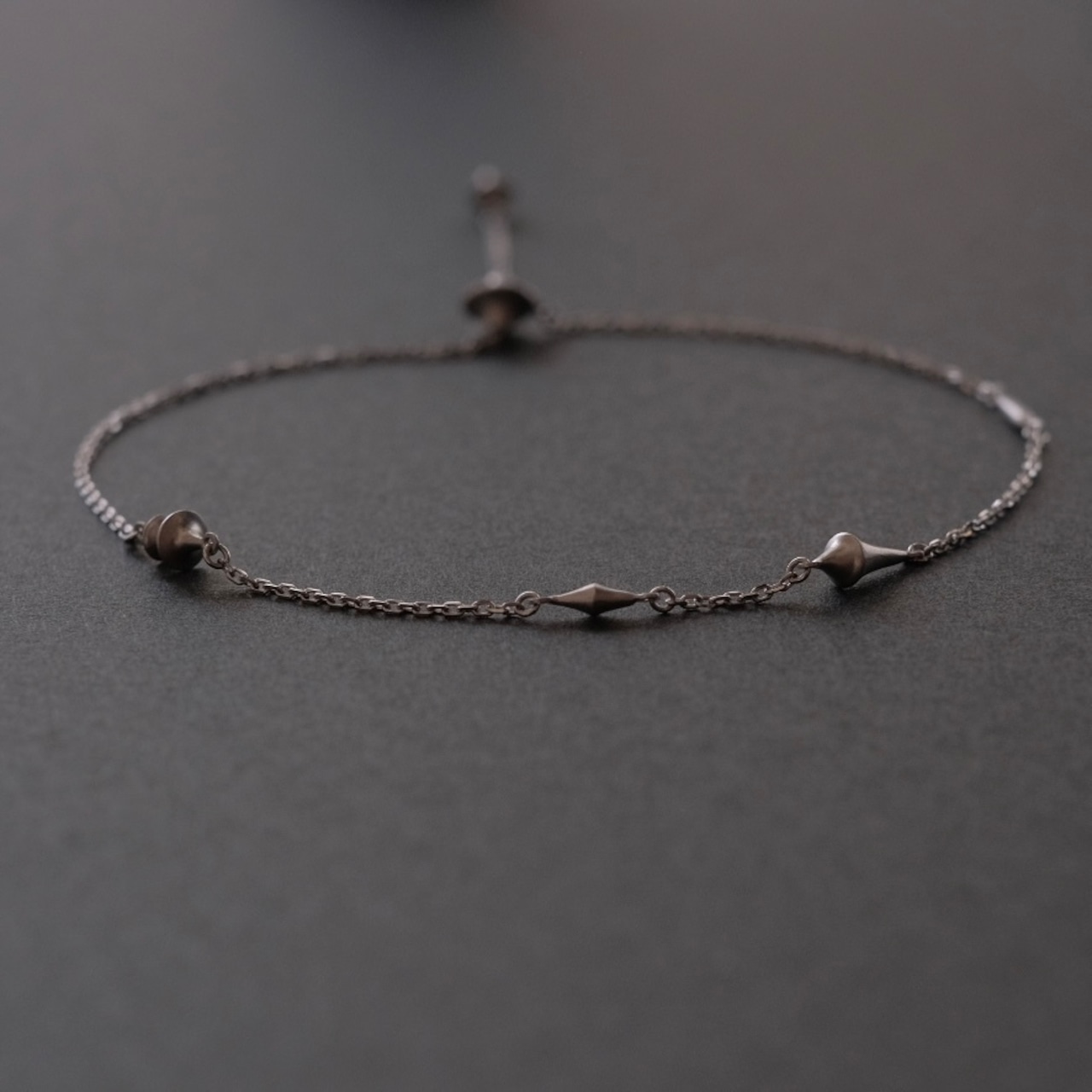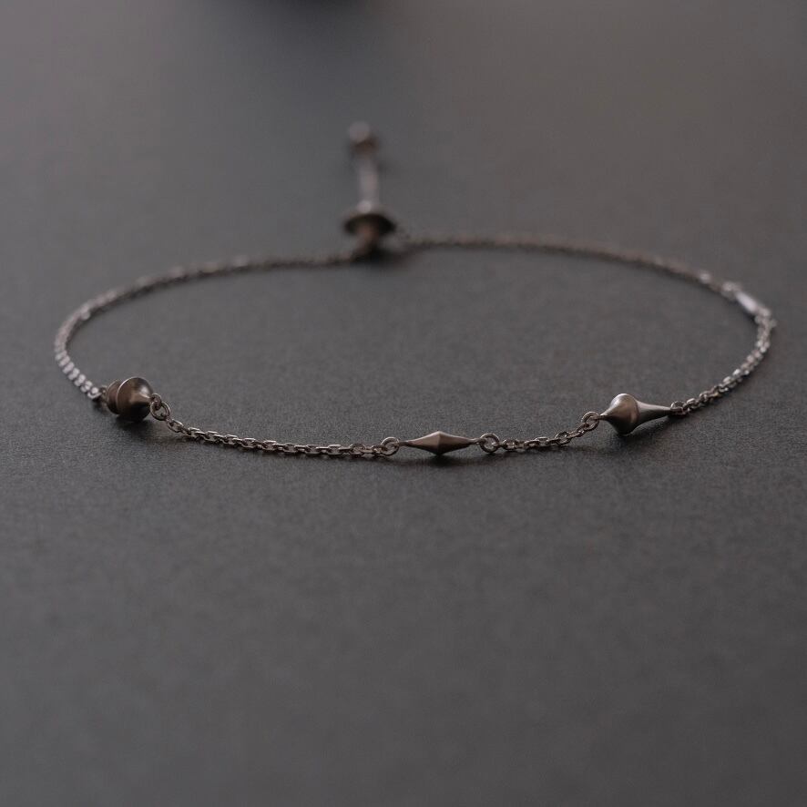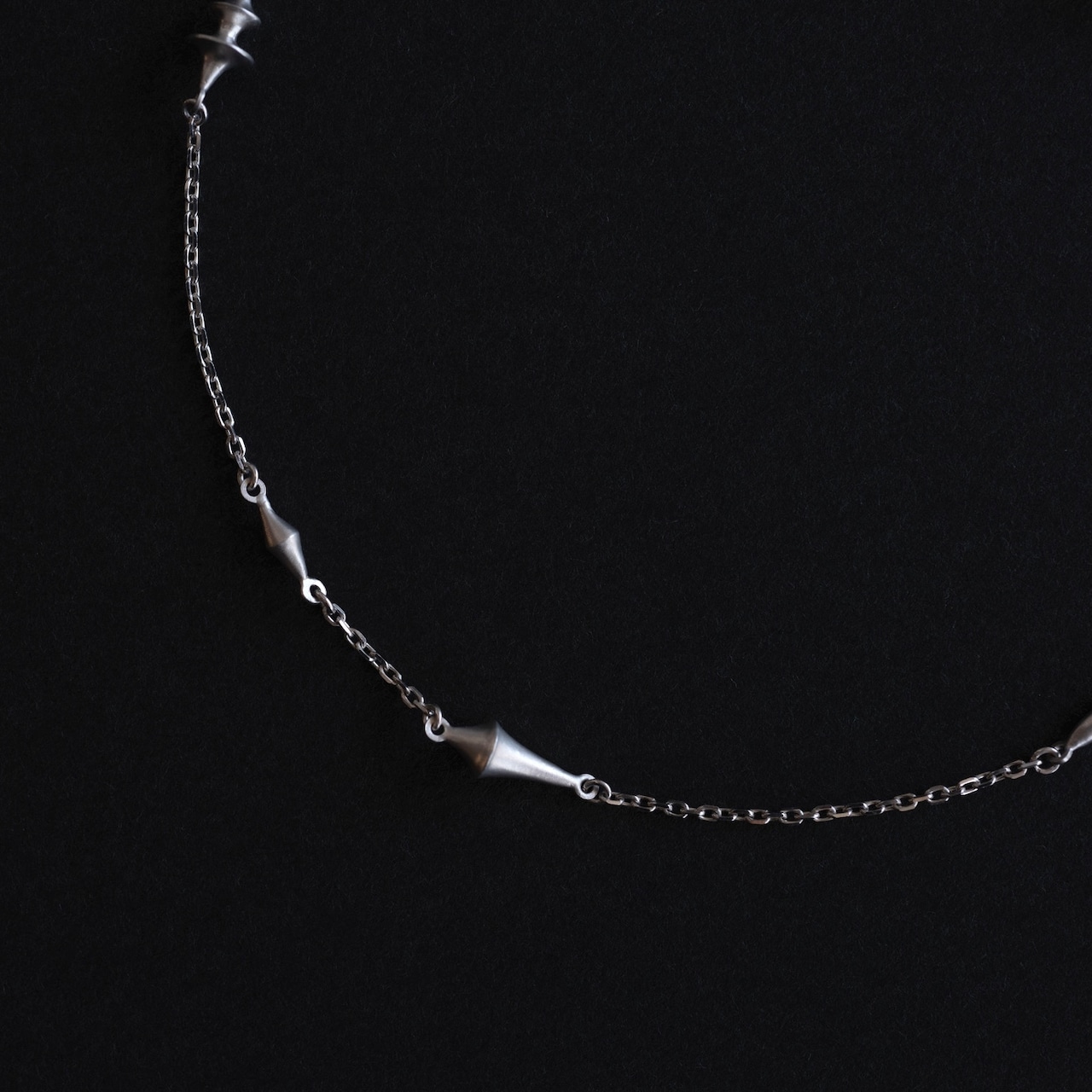 華奢なチェーンを繋いで連なるのは、遠くから聞こえてくる音の響きをモチーフにした、シャープなシルエットのパーツ。シリコンスライドパーツも含め、チェーンを繋ぐパーツは全てKOHANオリジナル。遠鳴シリーズの他アイテムと組み合わせるのもおすすめです。