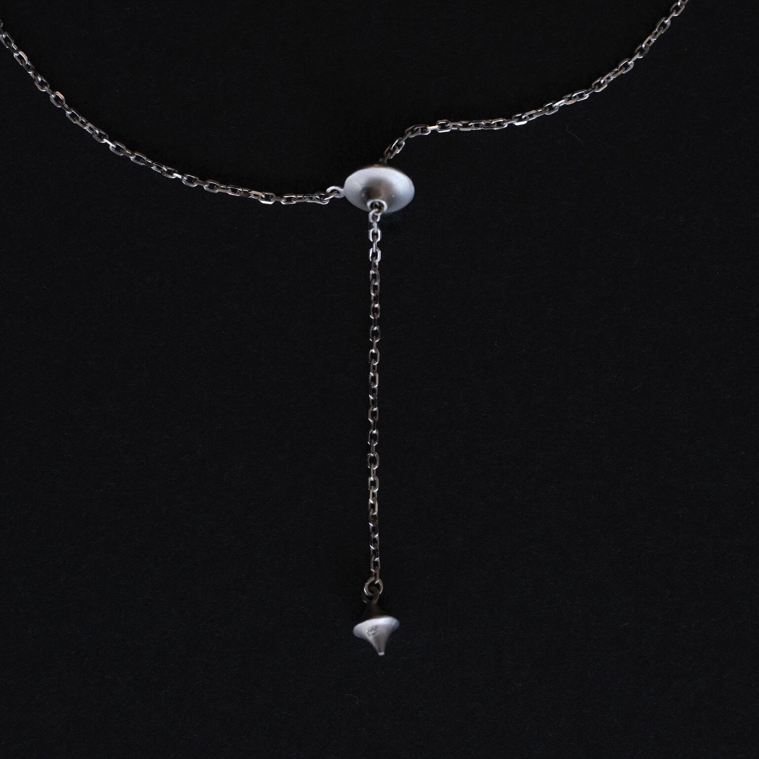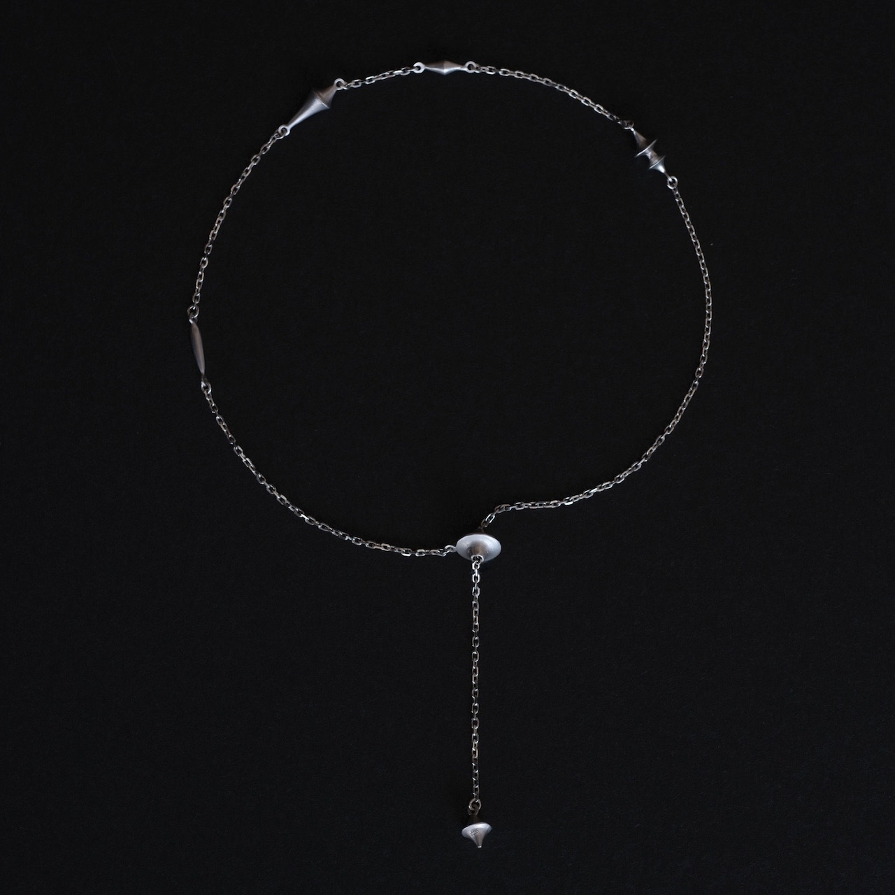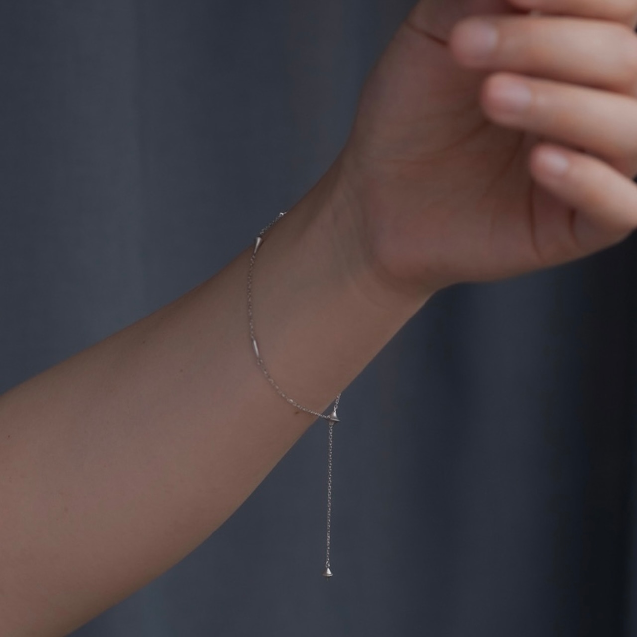 華奢なチェーンを繋いで連なるのは、遠くから聞こえてくる音の響きをモチーフにした、シャープなシルエットのパーツ。シリコンスライドパーツも含め、チェーンを繋ぐパーツは全てKOHANオリジナル。遠鳴シリーズの他アイテムと組み合わせるのもおすすめです。