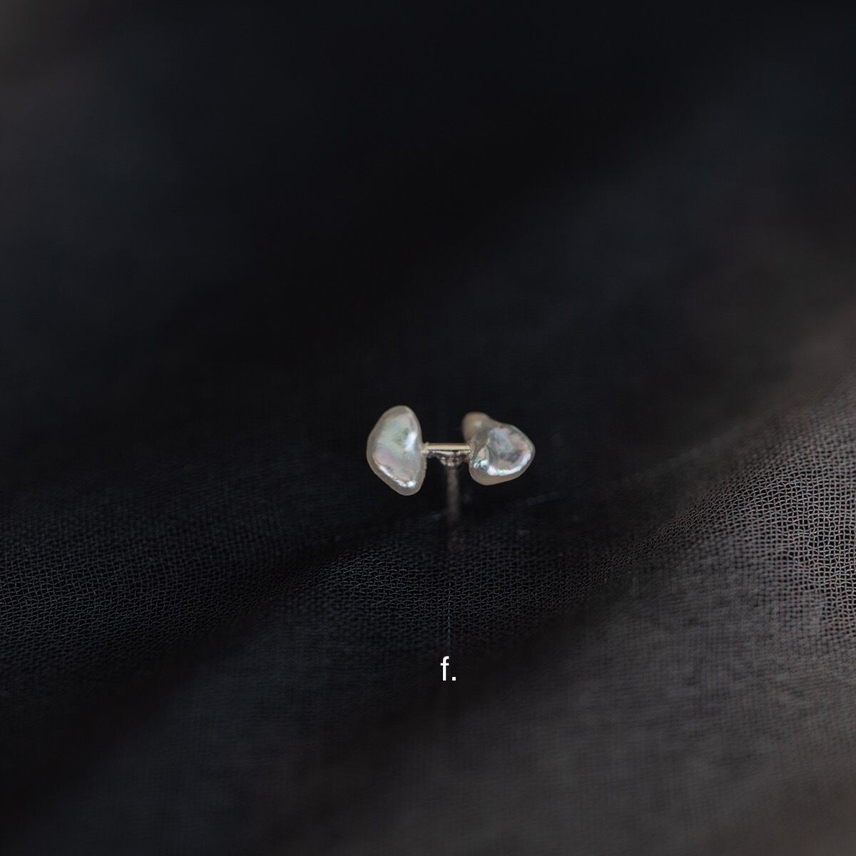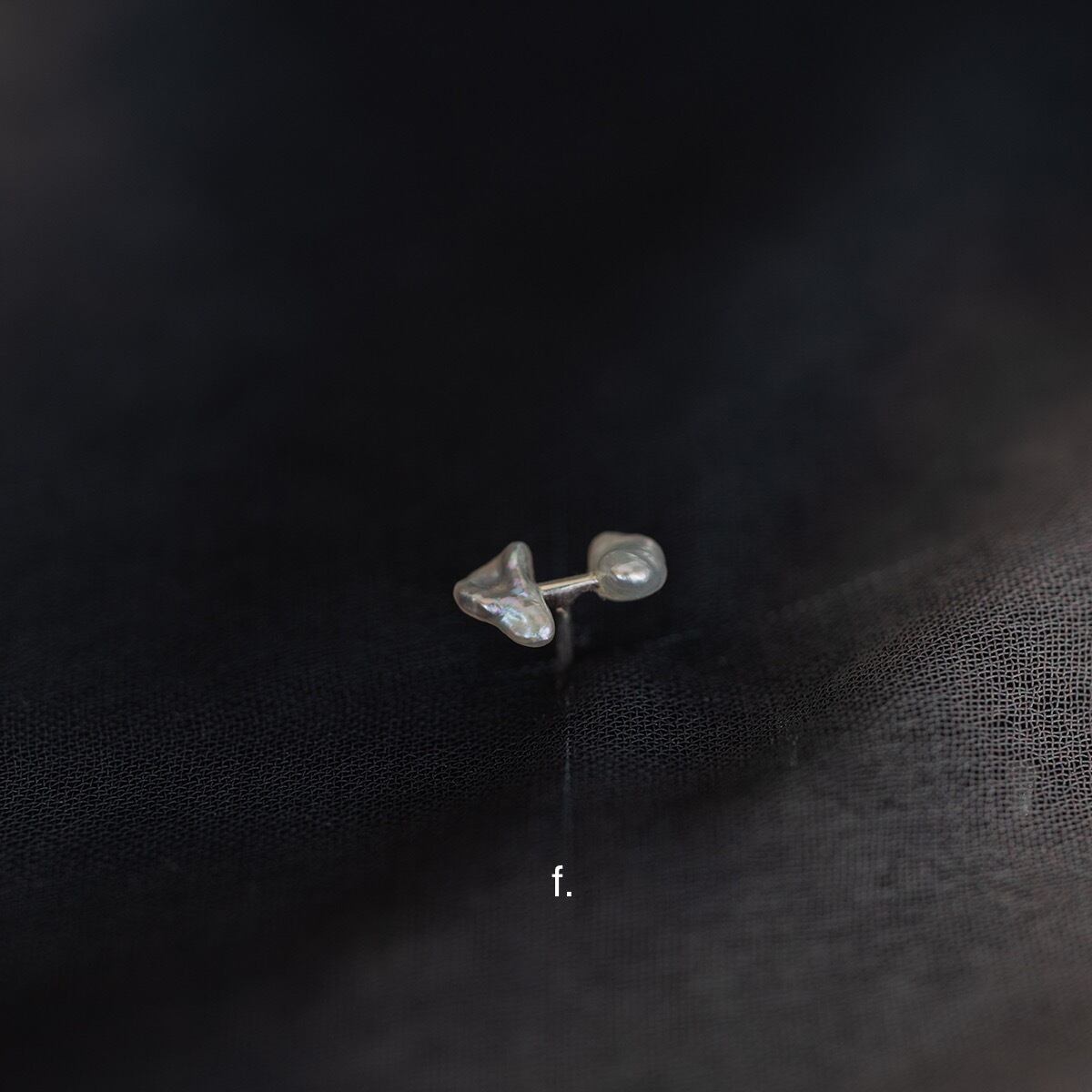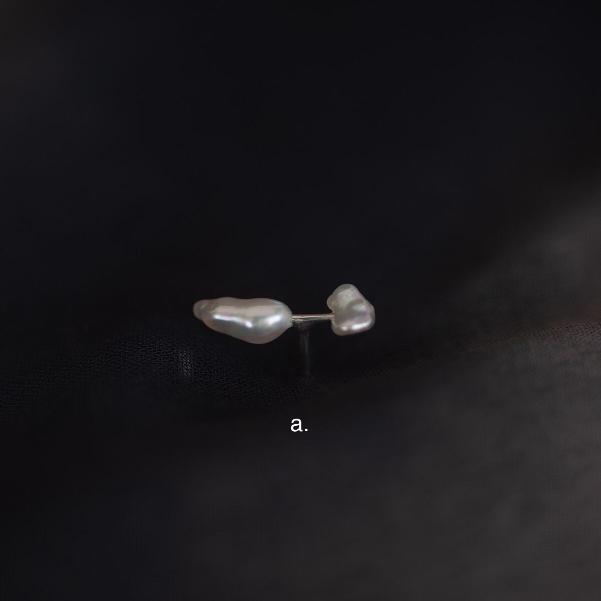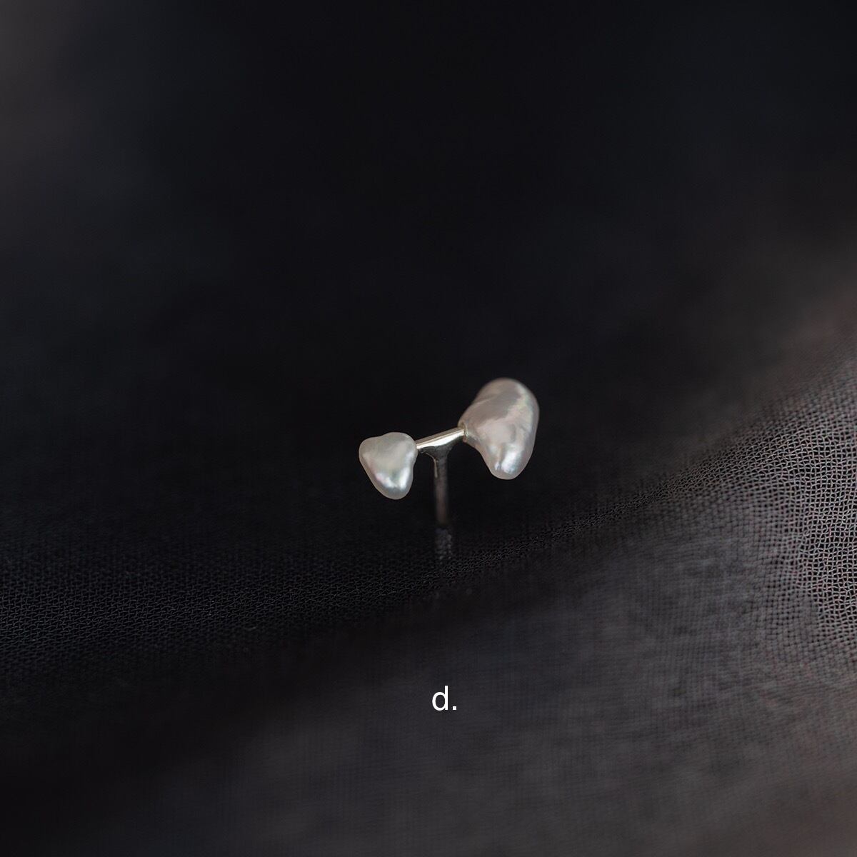 ケシ真珠と呼ばれる愛らしい様々な形状をした真珠の中で、特に極小のものを2粒選び取り、リズム感のある配置で使用した片耳ピアスです。