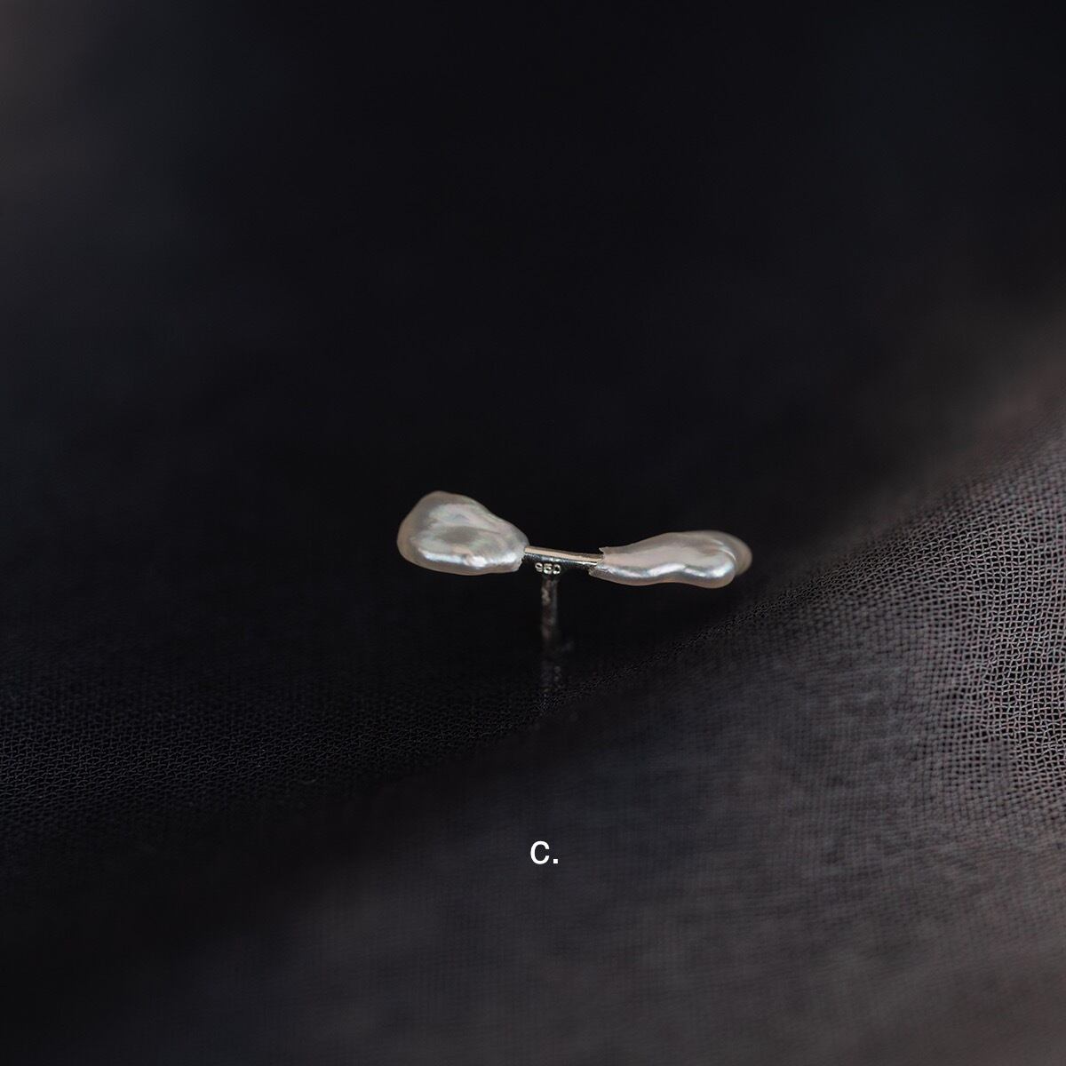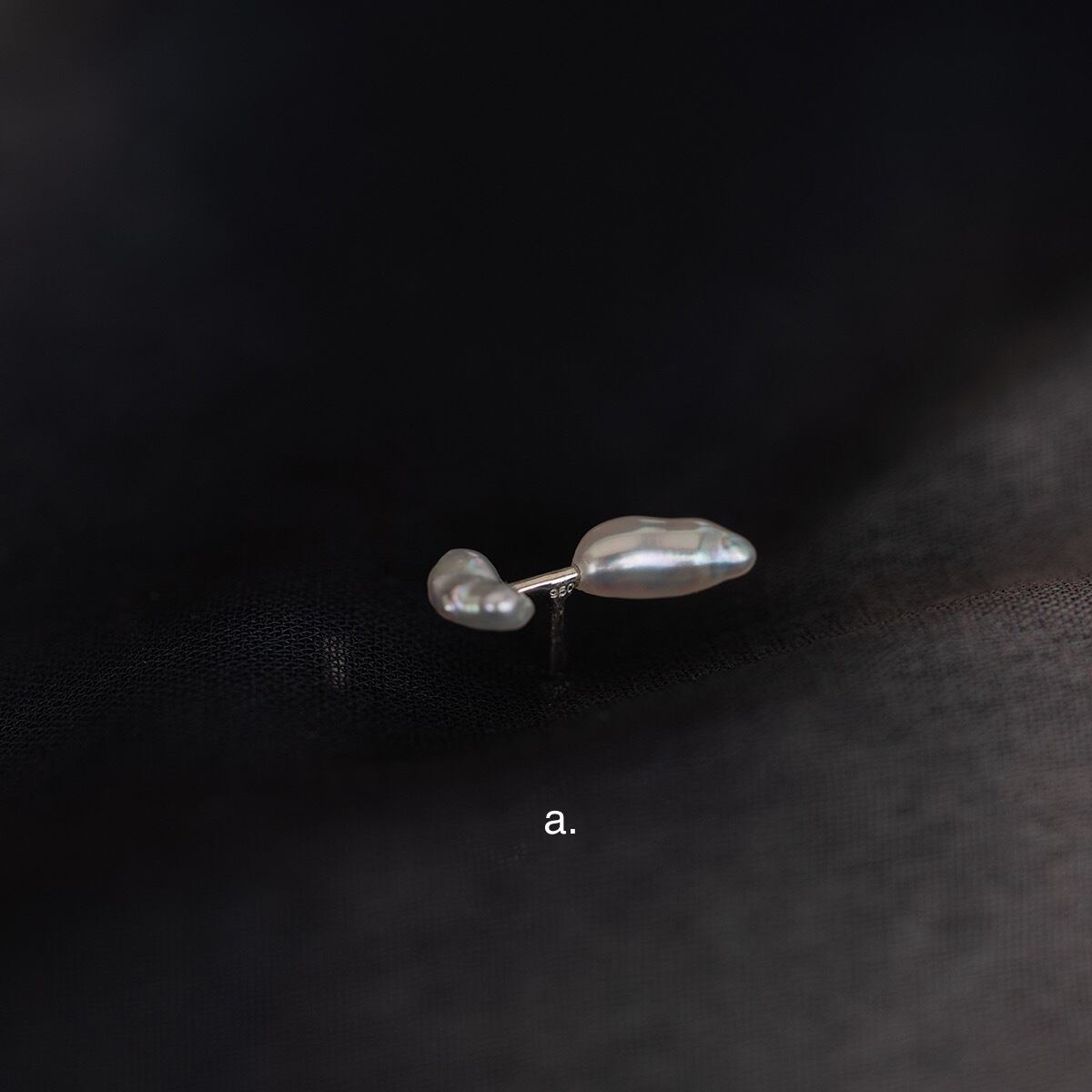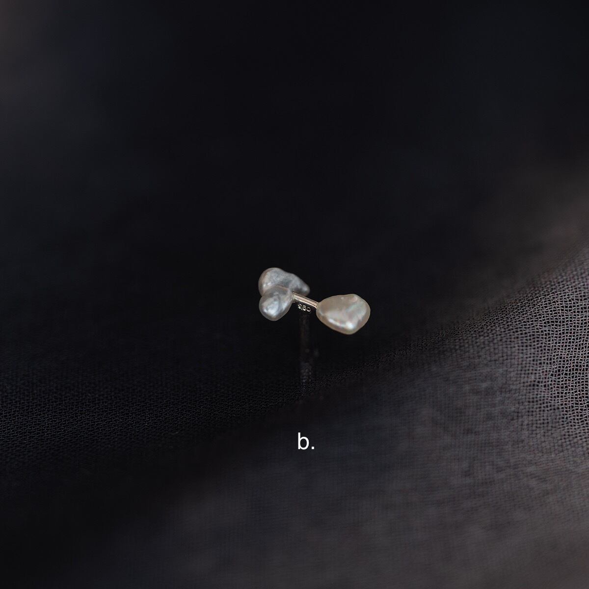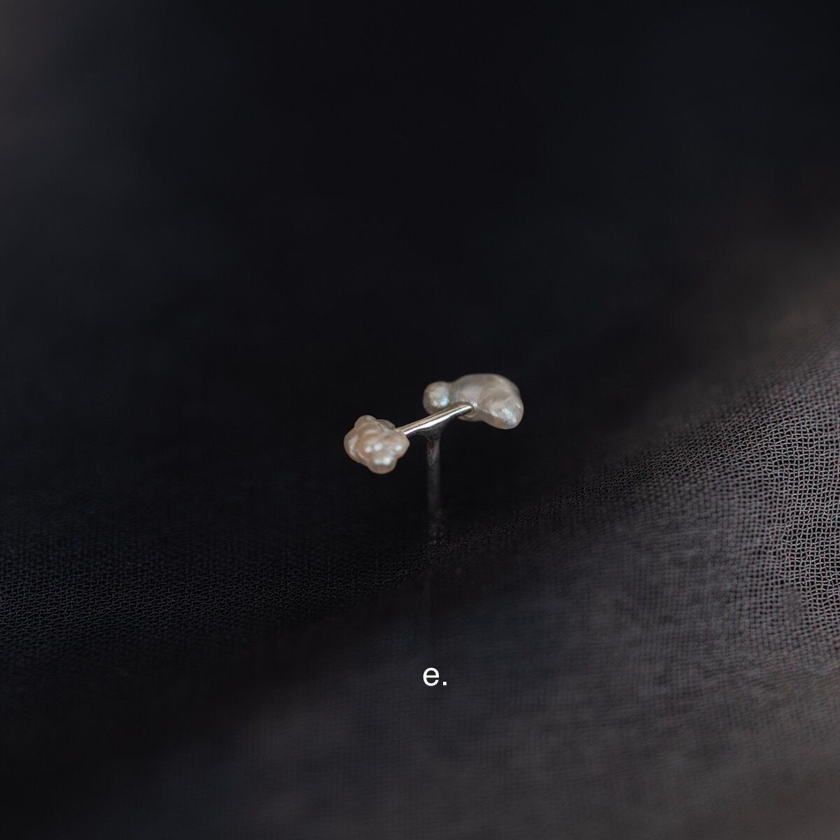 ケシ真珠と呼ばれる愛らしい様々な形状をした真珠の中で、特に極小のものを2粒選び取り、リズム感のある配置で使用した片耳ピアスです。