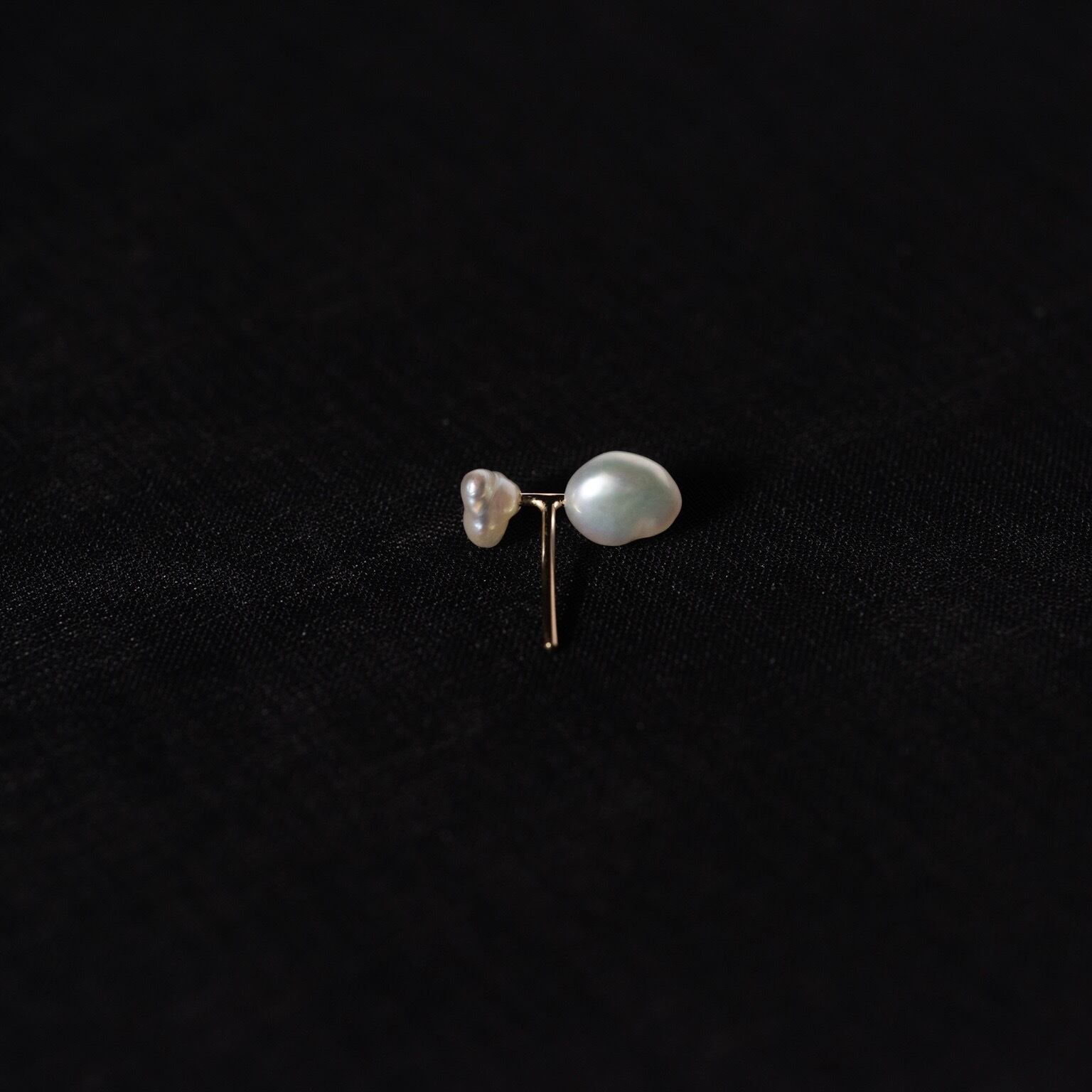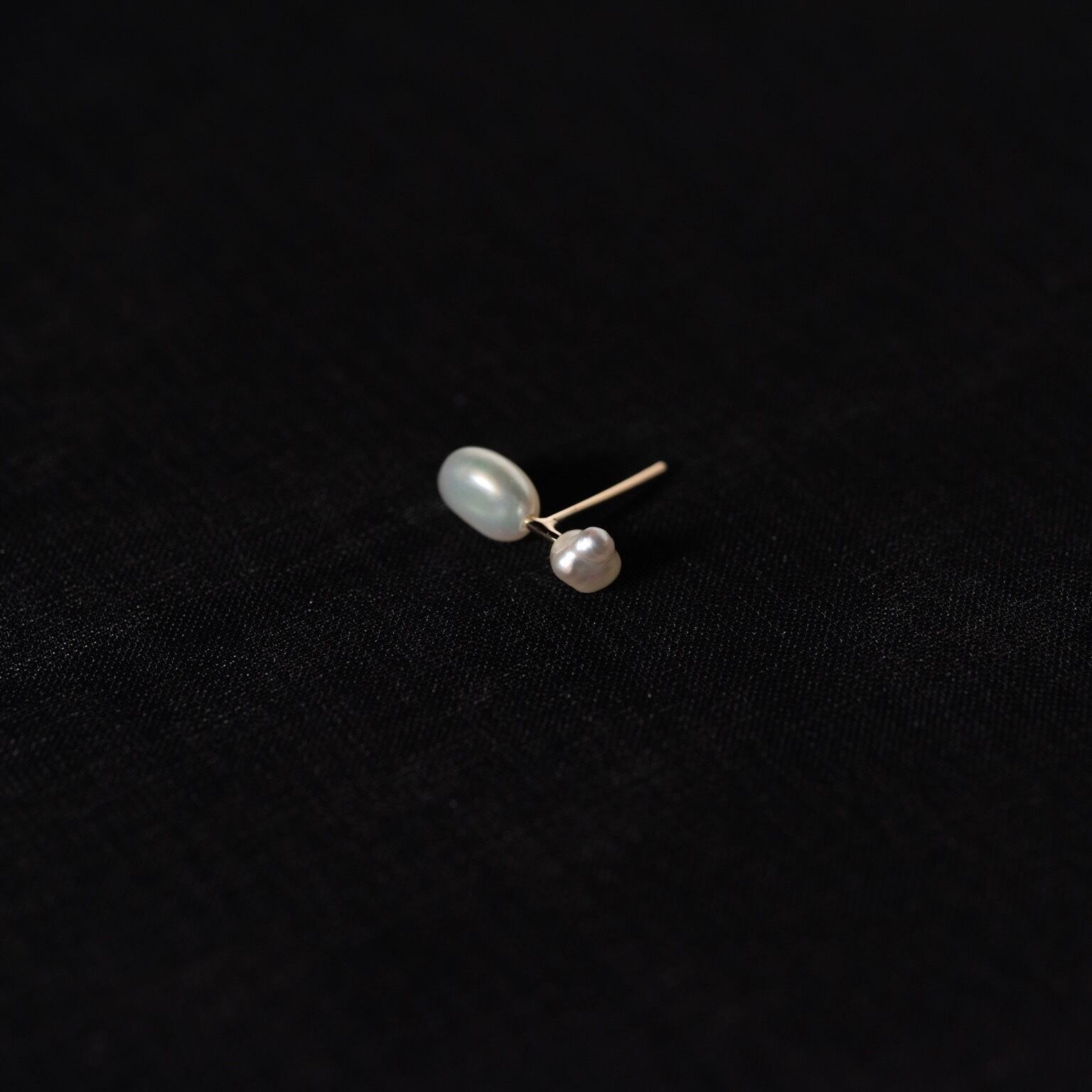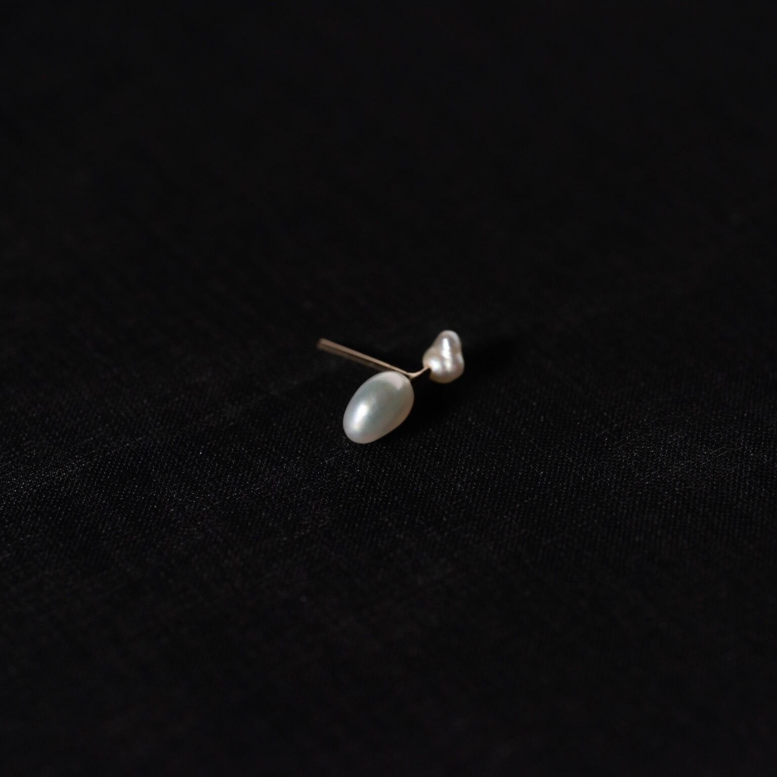 ケシ真珠と呼ばれる愛らしい様々な形状をした真珠の中で、特に極小のものを2粒選び取り、リズム感のある配置で使用した片耳ピアスです。
