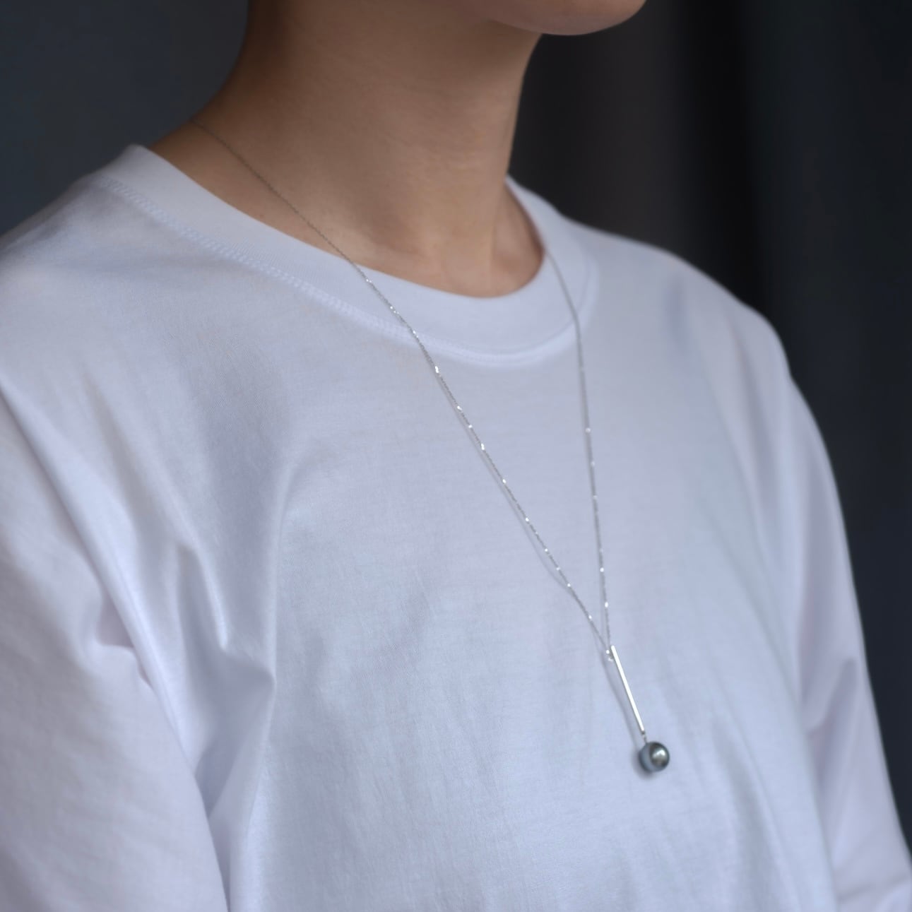 ペンダントトップにはすっと伸びた銀製パーツの先に揺れる黒蝶真珠。